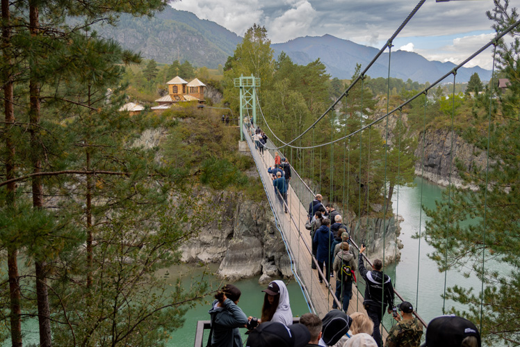 Первая остановка — село Чемал, где находится подвесной мост на остров Патмос. Этот мост ведёт к храму Иоанна Богослова, уютно расположившемуся на скале прямо в середине реки Катунь. Здесь ощущается удивительная тишина и умиротворение.