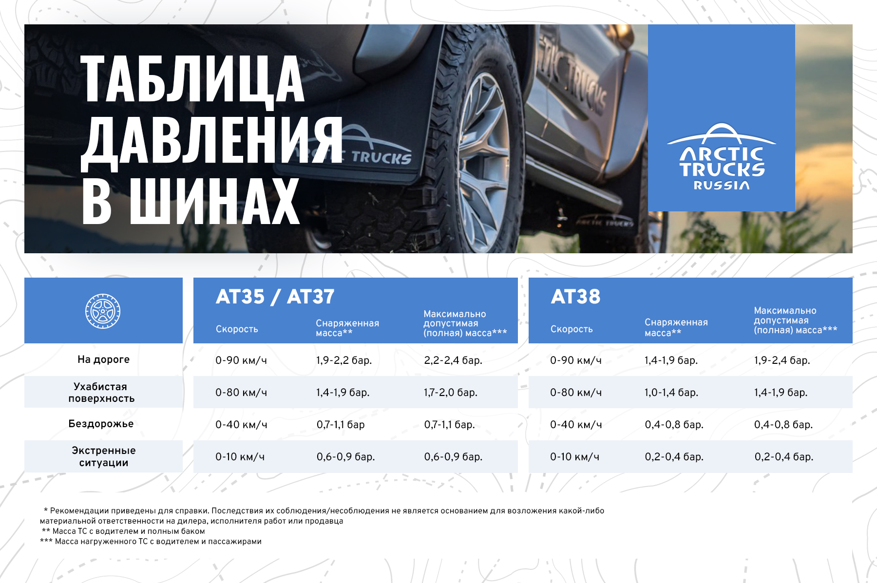 Следующие рекомендации разработаны для эффективной и безопасной эксплутации шин на автомобилях Arctic Trucks в комлектациях AT35, AT37, AT38. Для автомобилей Arctic Trucks в комплектации AT33 следует придерживаться информации о давлении в шинах, представленной в руководстве для владельца базового автомобиля, а также на наклейке, расположенной на стойке кузова.